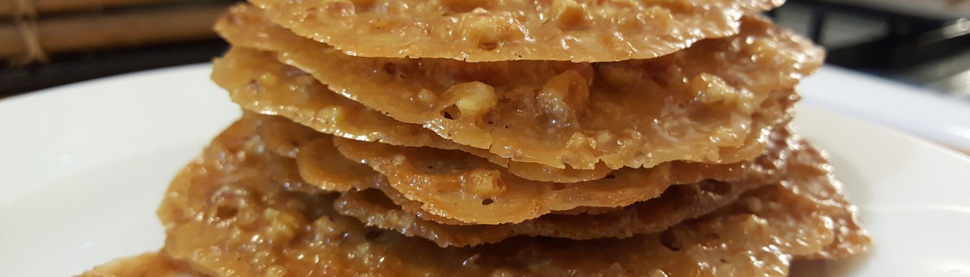 Confession: sometimes I dare myself to cook things just to see if I can do it good enough to not totally embarrass myself. Tonight I was thinking of my sweet sis-in-law, Sonya, and her delectable lace cookies, and I said “Hot damn, let’s do it!” My first try was hideous. FrankenCookie hideous. But not one to give up easily when it comes to food, I persevered and pulled off a pretty good batch of delicate pecan delights.