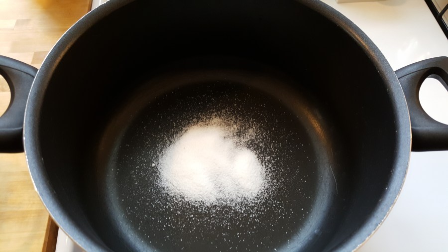 Place a large pot or Dutch oven over a medium fire and place one tablespoon of the granulated sugar in the middle of the pot. Over the next 3-4 minutes, the sugar will begin to melt. If the pot begins to smoke, turn the fire down to medium-low.