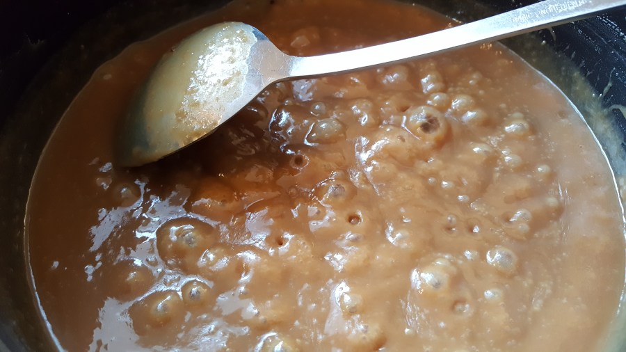 Once the sugar is almost completely melted, place the remainder of the granulated sugar, the dark brown sugar, the evaporated milk and the condensed milk in the pot and stir, using a whisk or the back of a large spoon to break up any clumps of sugar and to slowly and gently scrape up the melted sugar off the bottom of the pot. Don’t worry about the hard bits you might encounter; they will dissolve during the cooking process. You should have about 28-30 minutes left on your timer.